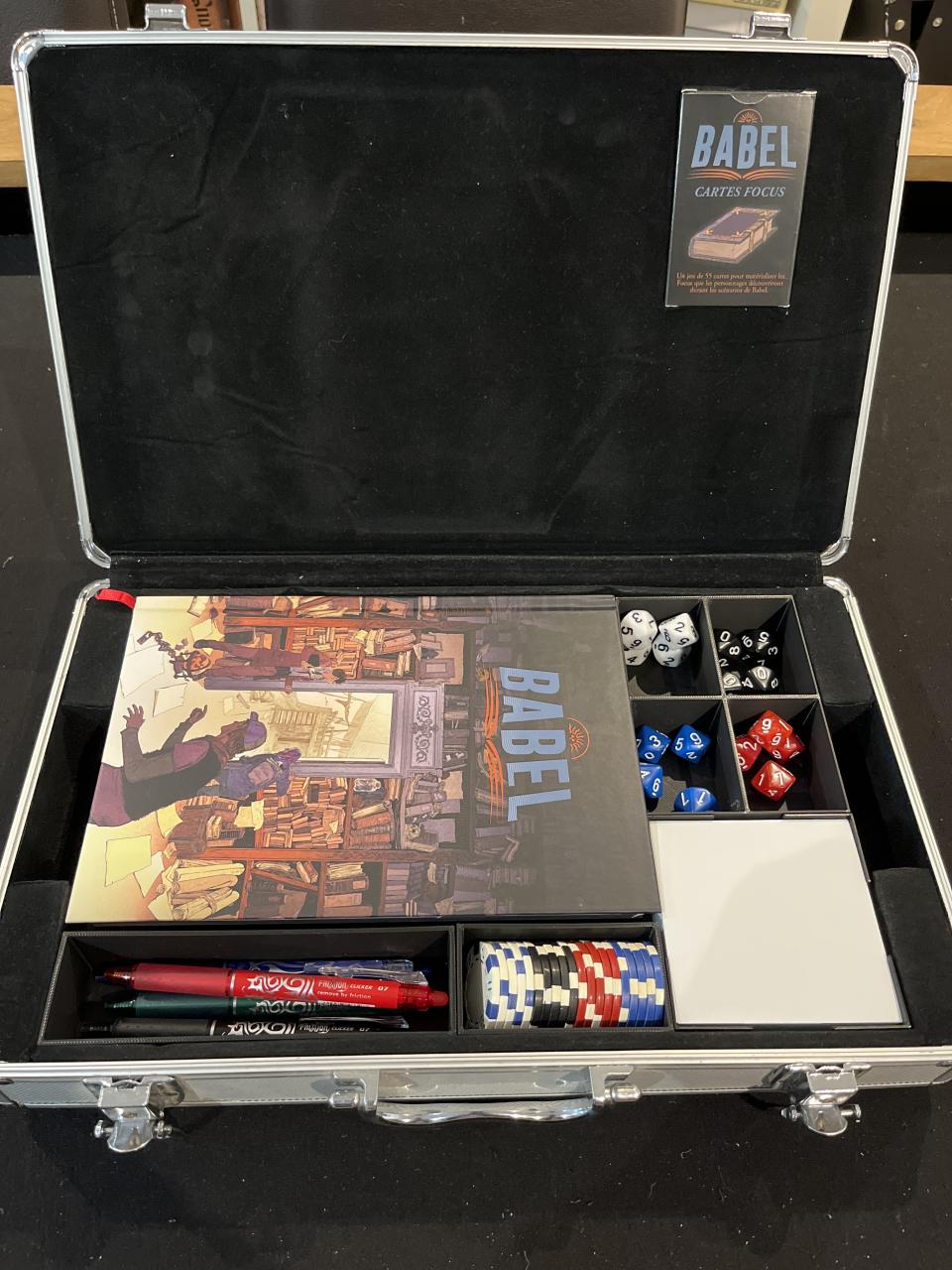 Vends kit complet pour jouer à Babel : Jeux de rôle Babel + écran du MJ + livret « rester à la page » + livret Initiative + Fables + jeux de cartes Focus. Le tout rangé dans une vieille malette avec insert 3D pour ranger bloc note, dés, Stylo et jetons de poker nécessaire pour jouer. Tout est fourni comme sur la photo. À prendre en main propre à Bordeaux ou en mondial relais à vos frais.
